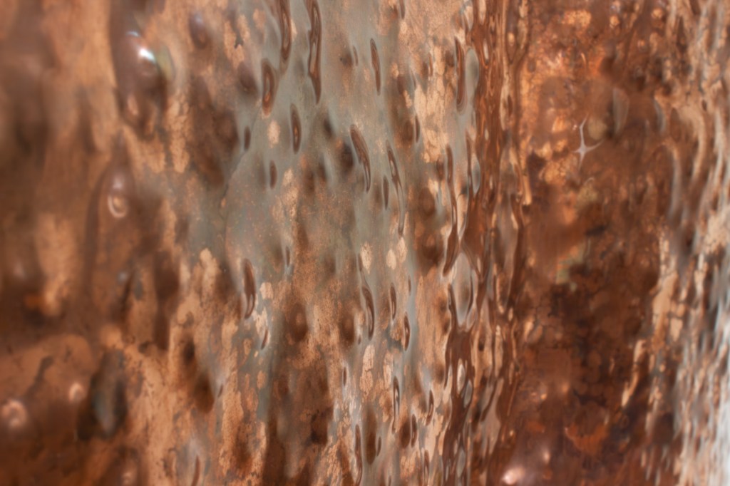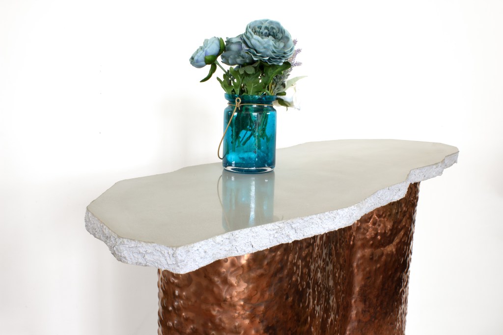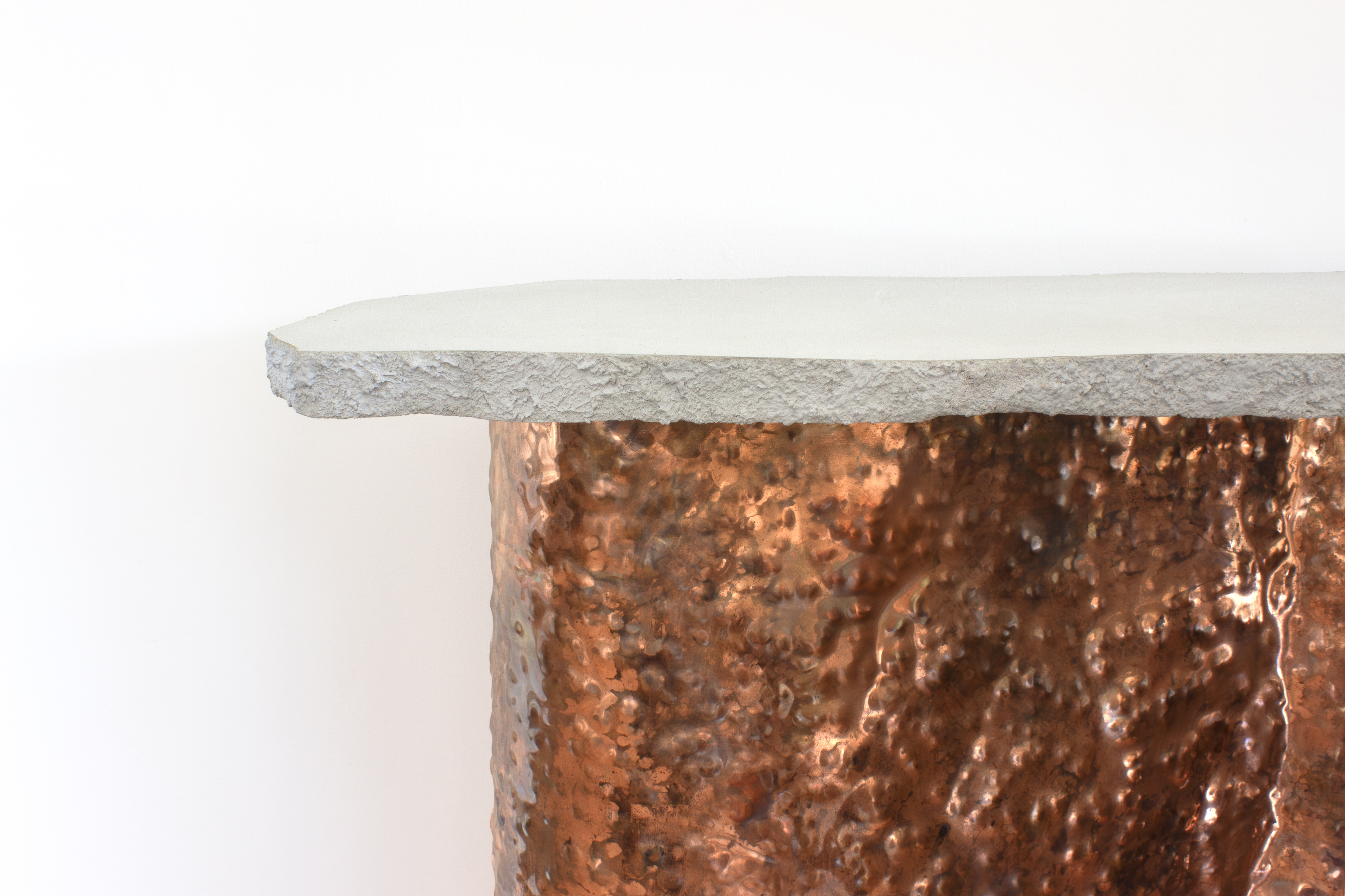 The copper base is hand-bent and hammered to represent the collisions that occur in the formation process whilst creating a flowing, organic form. The patinated copper showcases the long timescale over which these events take place, while also celebrating the copper’s natural colours and beauty.